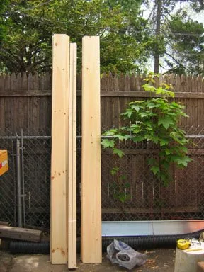 In the above image, I have four planks lined up nicely, if imperfectly, on the frame and an additional four planks for the opposite frame. I wasn't too concerned with the final appearance —these were scrap wood boxes after all. Since these planks are 3.75 inches wide, a stack of four comes to a height of 15 inches. The 2x2 verticals posts are 14 inches tall, plus the bottom horizontal member is 1-1/2 inch thick, making the "U" shaped frame a total of 15-1/2 inches. 15-1/2 inches minus 15 inches allows for a 1/2 inch reveal of the frame at the bottom.